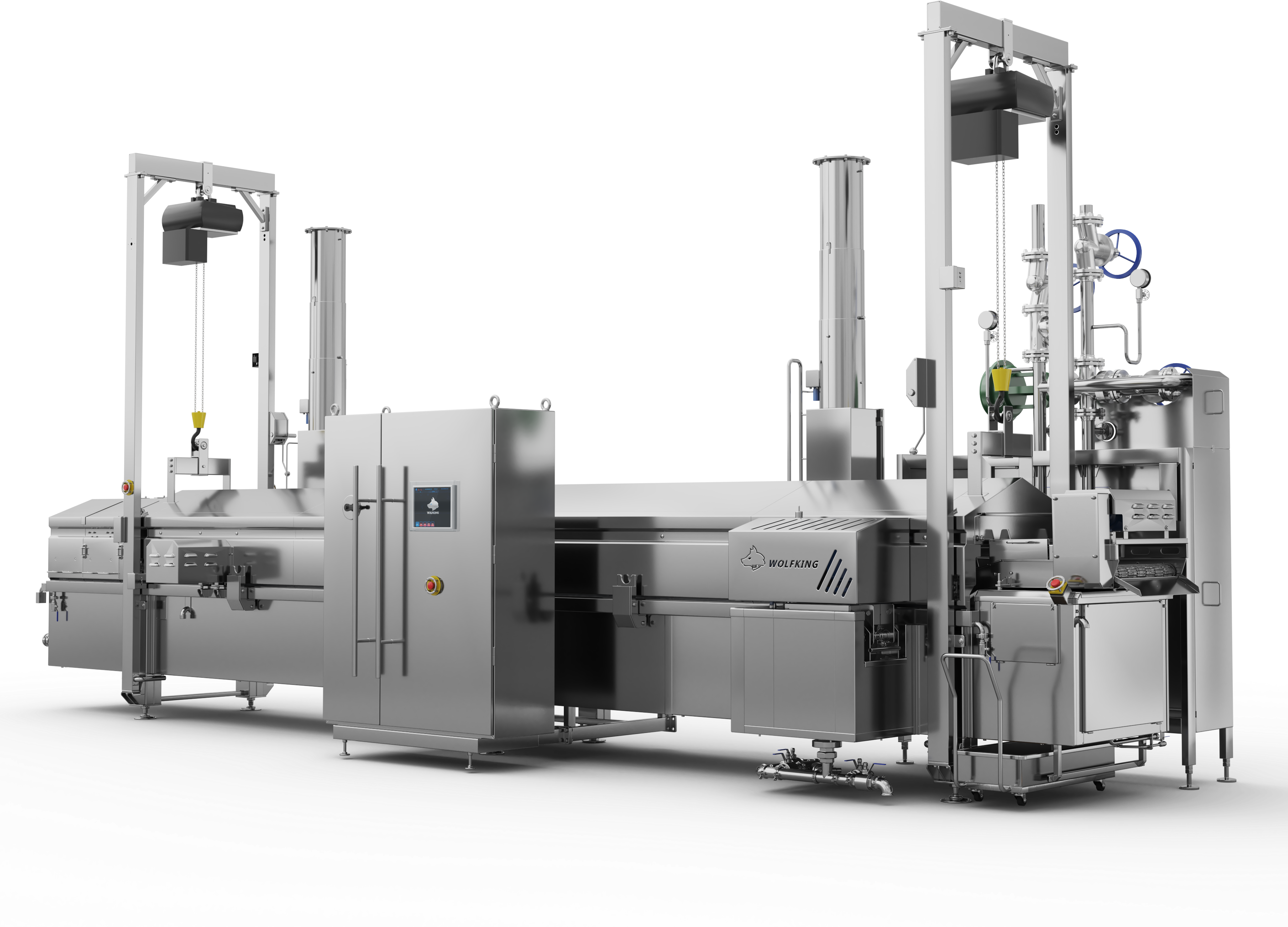 Wolfking electric heating fryer is a modular fryer available in lengths from 4 to 6 meters, and in widths of 650 and 1050 mm. The heat exchanger delivers the highest heating capacity in the industry, and guarantees fast and uniform heating.